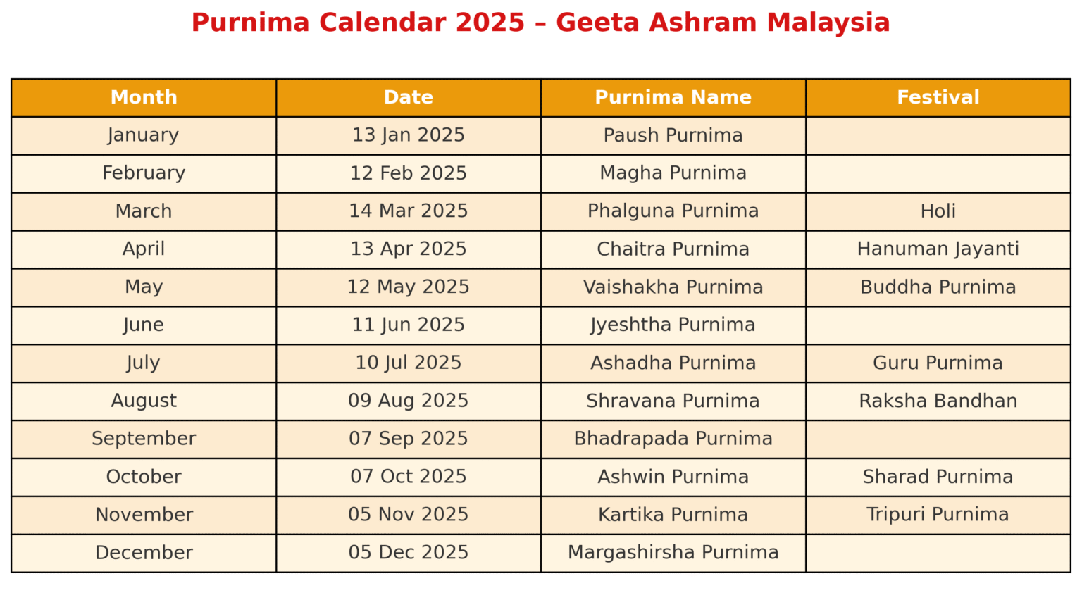 Purnima, the full moon night, symbolizes completeness, fulfillment, and abundance in many spiritual traditions. At Geeta Ashram Malaysia, we celebrate this auspicious occasion to harness the moon’s powerful energy. It is believed that during this time, the moon’s illumination radiates positivity, offering divine blessings and spiritual nourishment to all. By participating in the rituals and practices of Purnima, we connect more deeply with our spiritual selves.