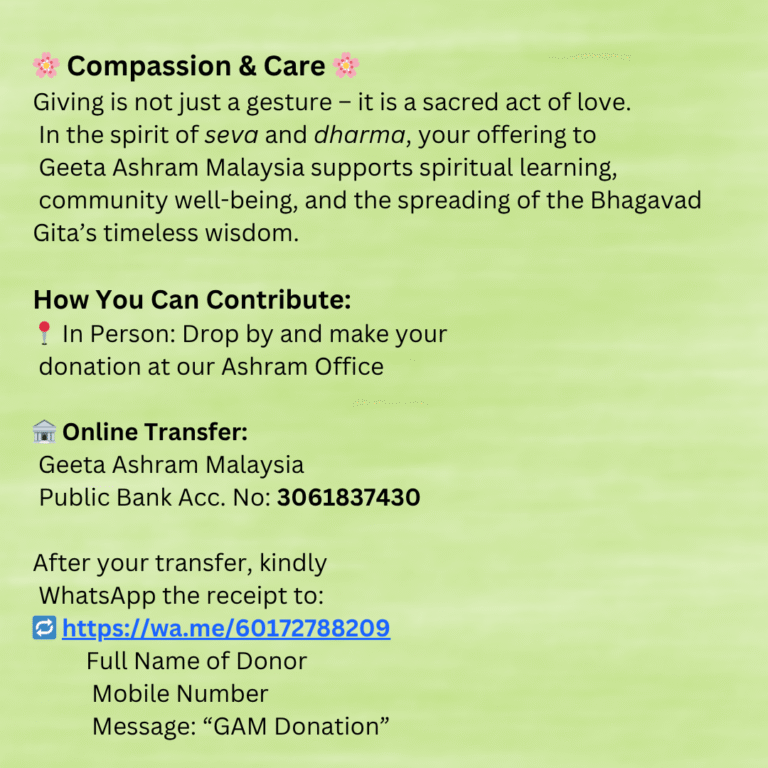 In the Indian spiritual tradition, giving is never just a transaction, it is a yajna, a sacred act of selfless offering. At Gita Ashram Malaysia, your donation is not simply support, it is seva, a heartfelt expression of devotion, gratitude, and purpose.