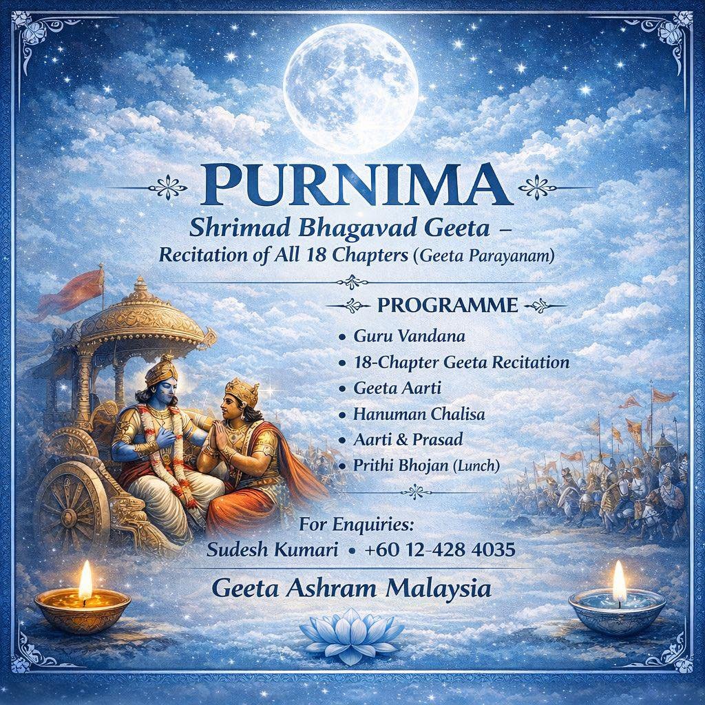 We invite you to join the community at Geeta Ashram every Purnima as we gather in Satsang. This is not just about chanting; it’s about slowly learning to recite the Geeta verses independently. Each Purnima offers a chance to deepen our understanding and connection to these sacred teachings while basking in the light of the moon’s energy. Together, we can celebrate this promise of divine blessings and the strength found in unity.