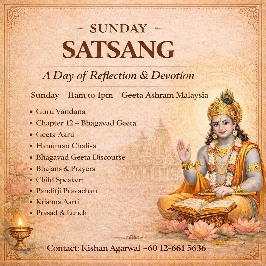 At Geeta Ashram Malaysia, we embrace the divine teachings of Shree Krishna during our weekly Sunday Satsang. These gatherings are not just events; they are serene experiences where wisdom flows freely and hearts connect. Every Sunday, devotees come together to share in devotion, as we create an atmosphere that is both friendly and welcoming.
